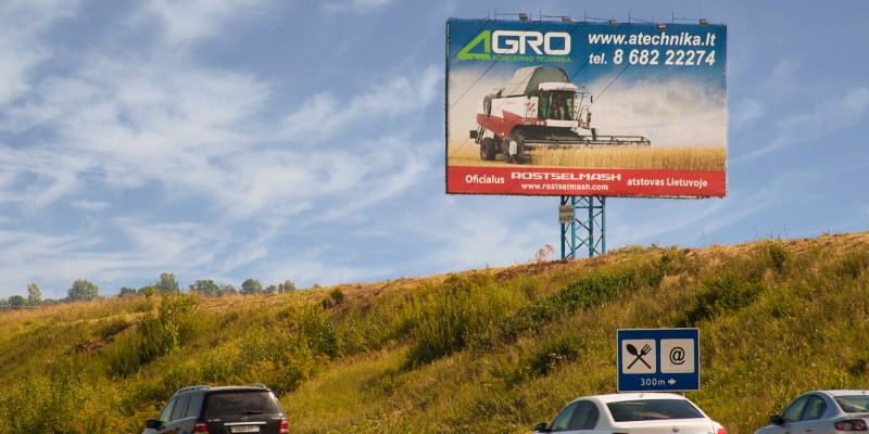 Going from Vilnius to Klaipėda billboard is on the left hand-side;