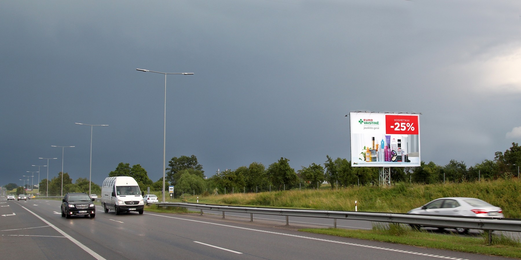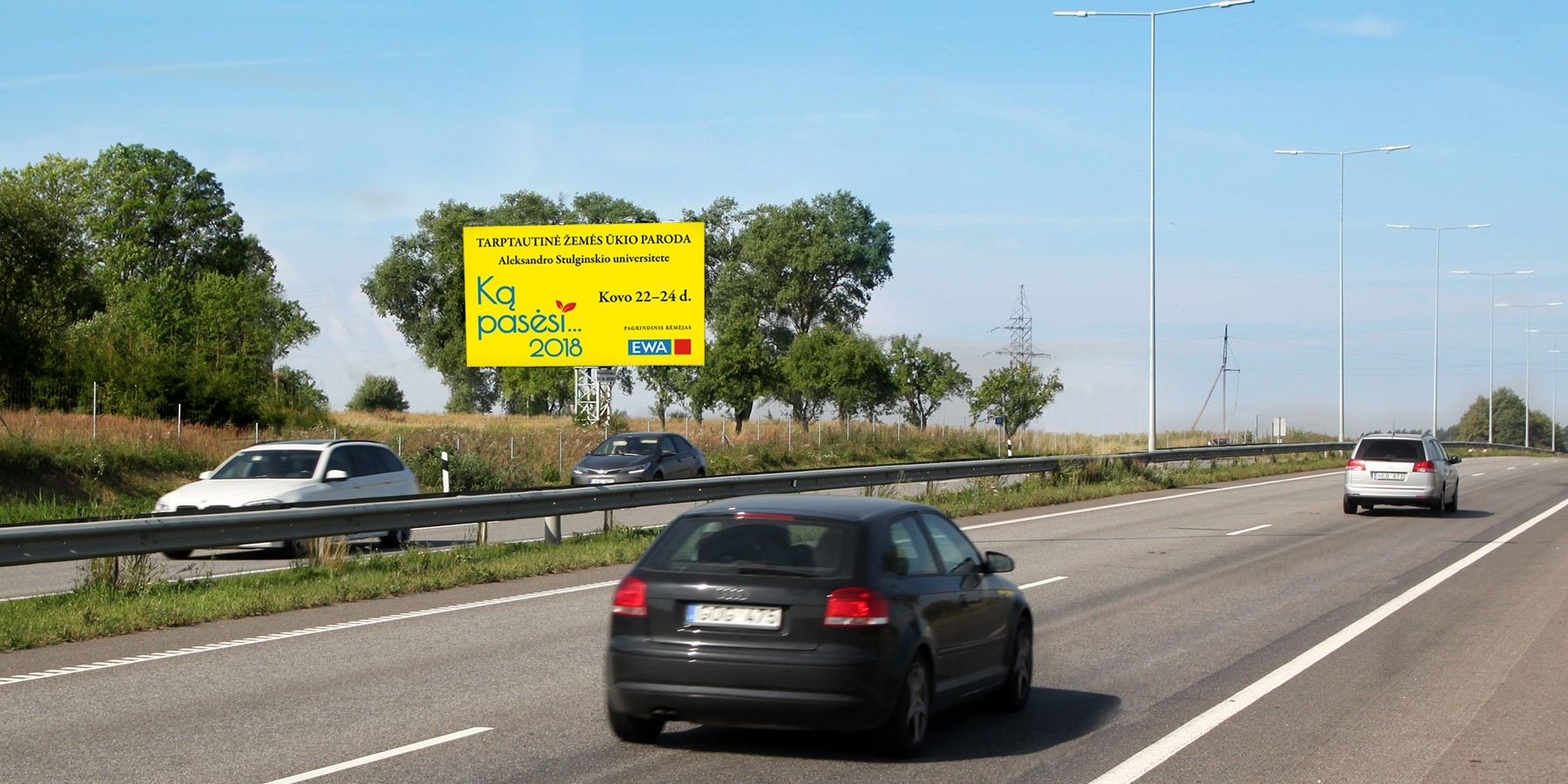 Double-sided billboard located 3 km past/in front of Kietaviskes viaduct.